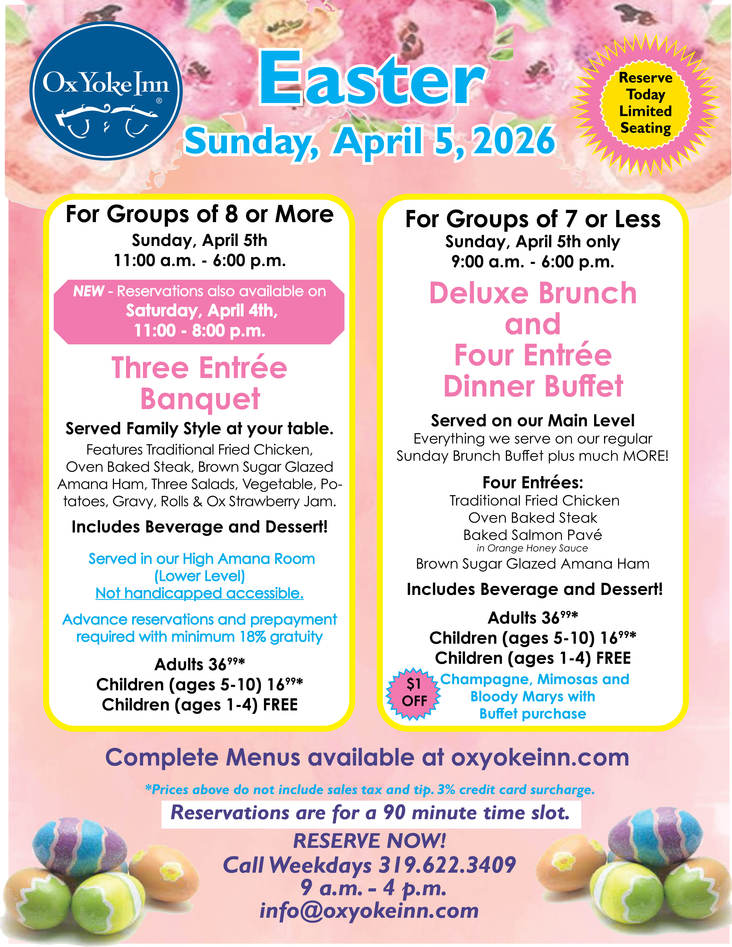 "An Amana Colonies Tradition Since 1940." The original location is world famous for serving "Family Style" in a home that was built in 1856. The Ox Yoke Inn® is a National Historic Landmark.