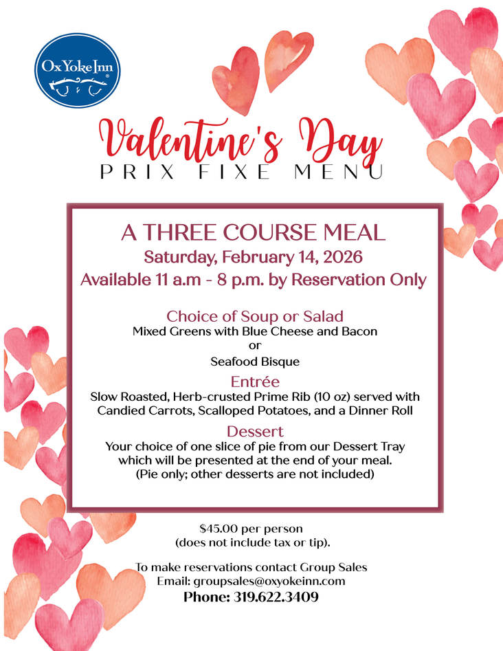 Plan to spend your Valentine's Day at the Ox. We have a Wine & Dine, four course dinner with Wine Pairings from White Cross Cellars, and also a Prix Fixe three course menu, sans wine. Reservations required.