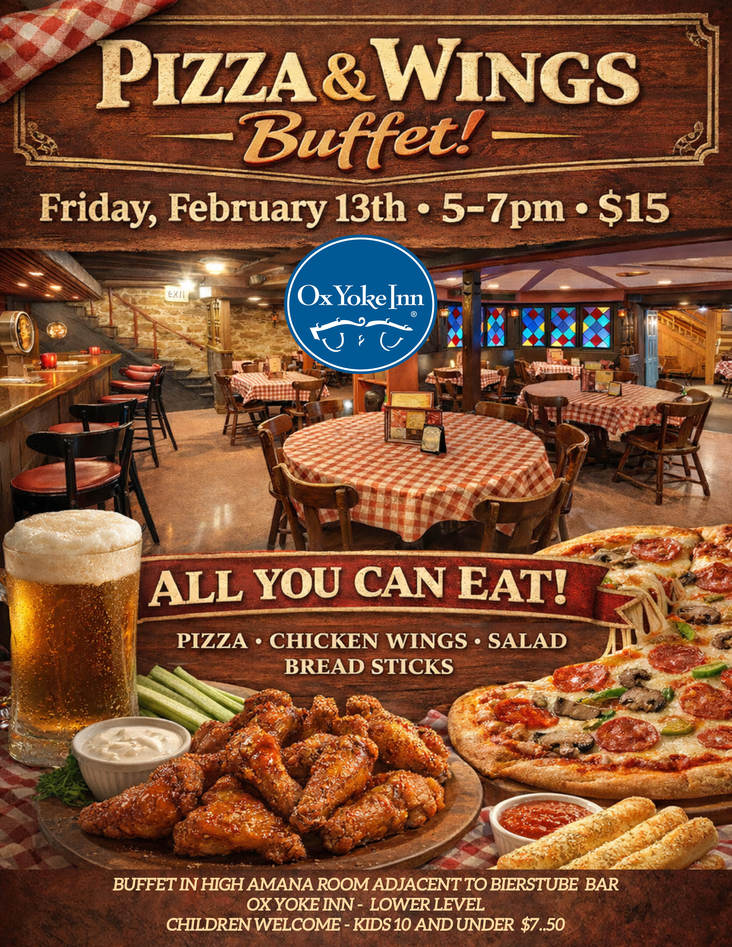 Specials: Feb. 6th All You Can Eat Wings & Fries; Feb 13th Pizza and Wings Buffet
