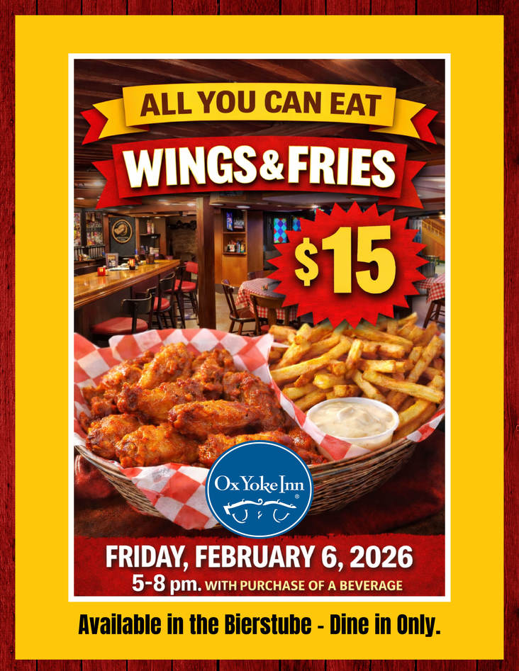 The Ox Yoke Inn® features traditional meals made from timeless Old World German and American recipes passed down from mother to daughter. Five generations of the Leichsenring family have worked at the Ox Yoke Inn serving hearty meals, freshly prepared with salads, vegetables, potatoes and breads. This is "Family Style."